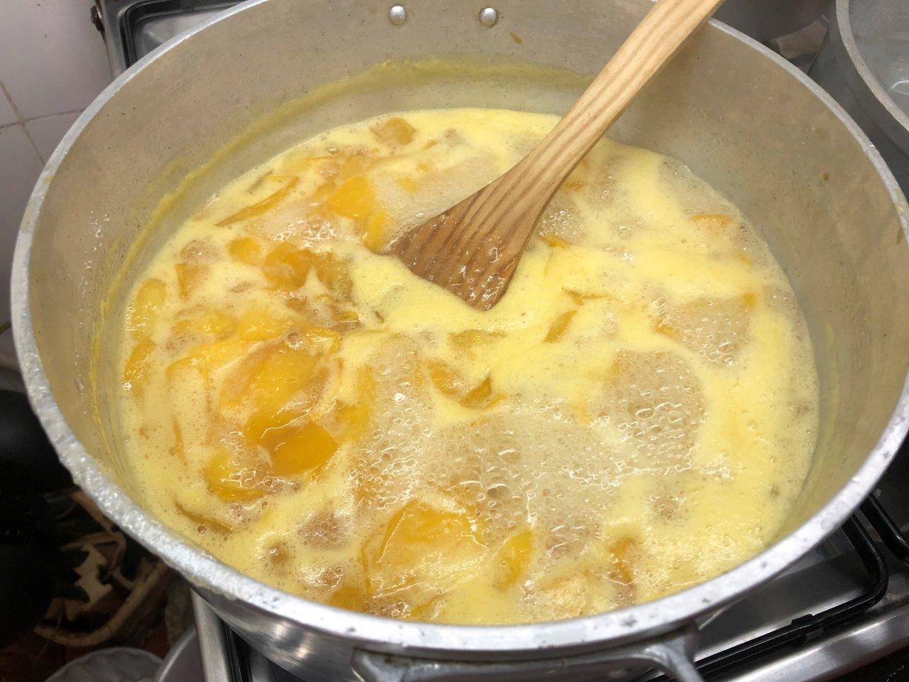 Durante cerca de 15 minutos vá mexendo o doce. Se ainda estiver muito líquido, experimente tirar um pouco e espalhe num prato frio. Se a forma se mantiver e não escorrer líquido, o doce está pronto!
