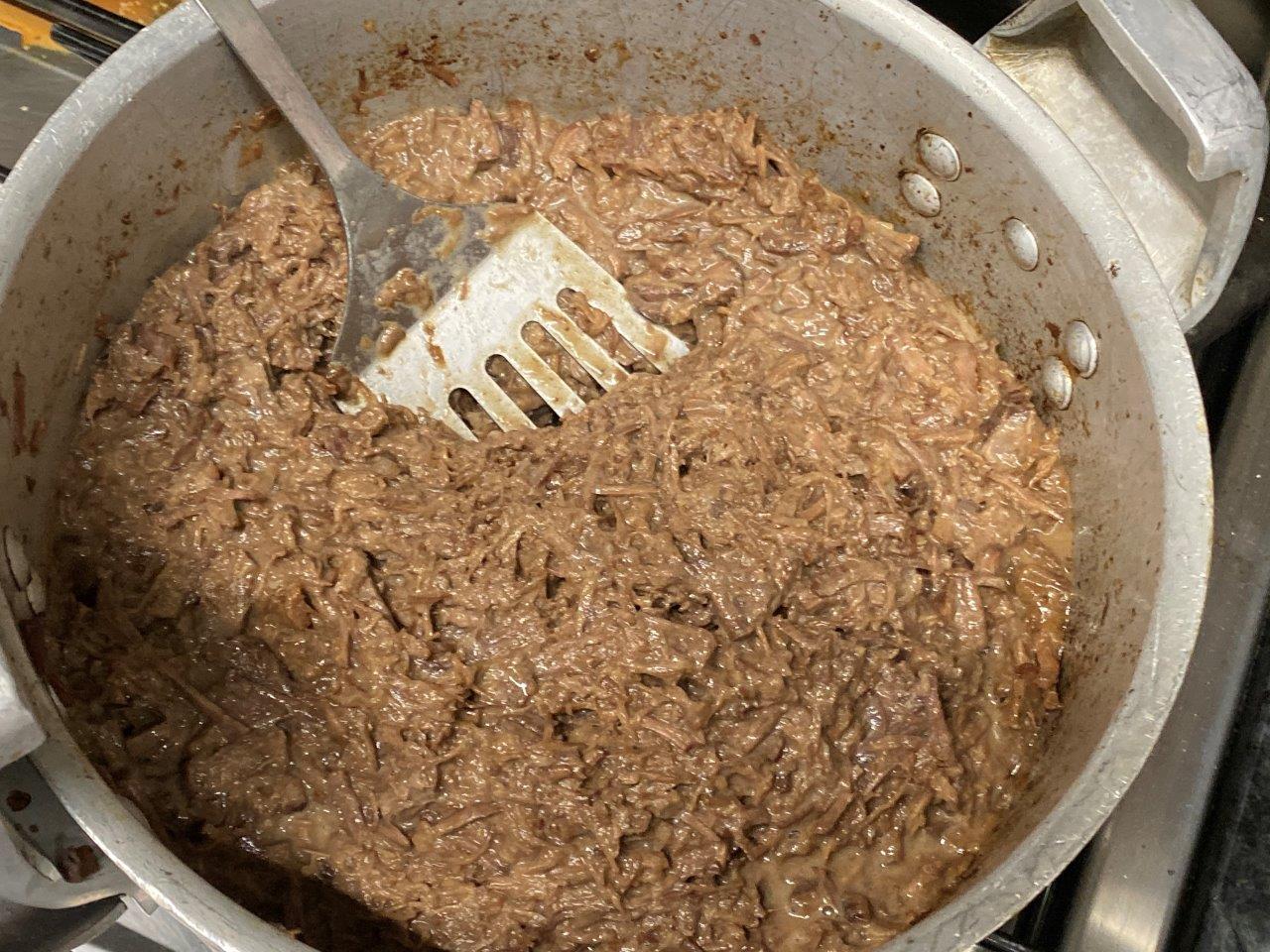 Com um esmagador, ou uma colher de pau, desfaça a carne até ficar em fios.