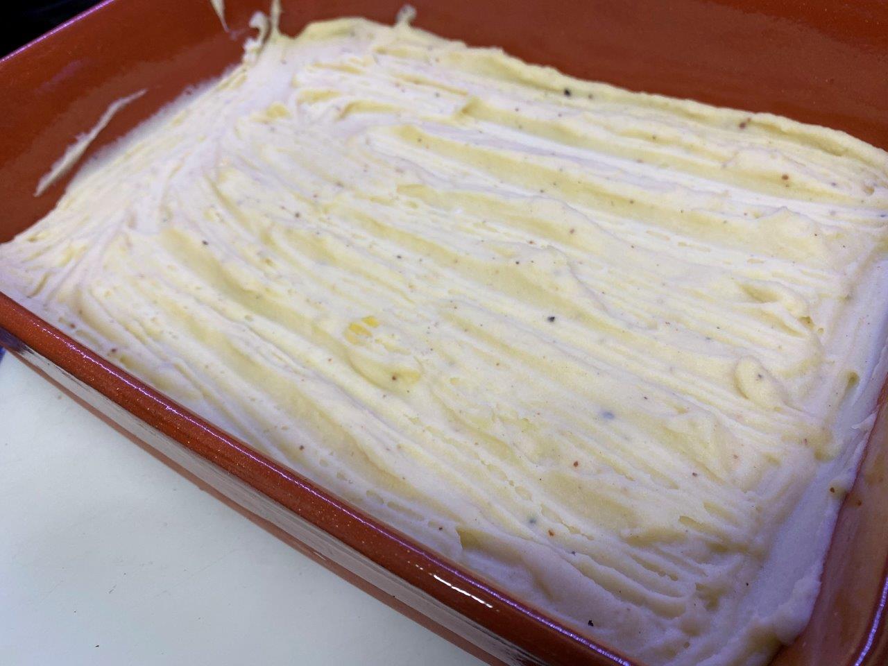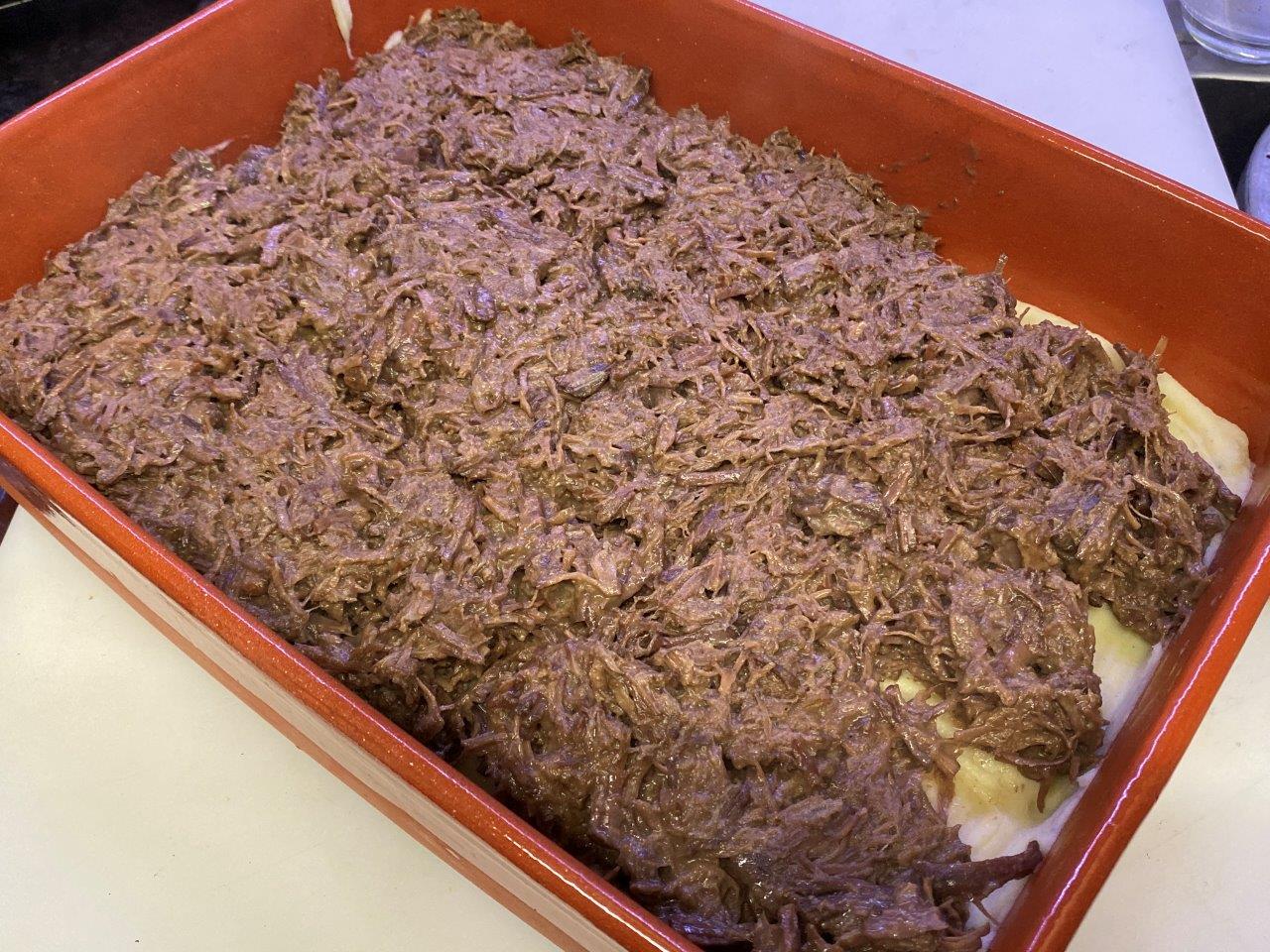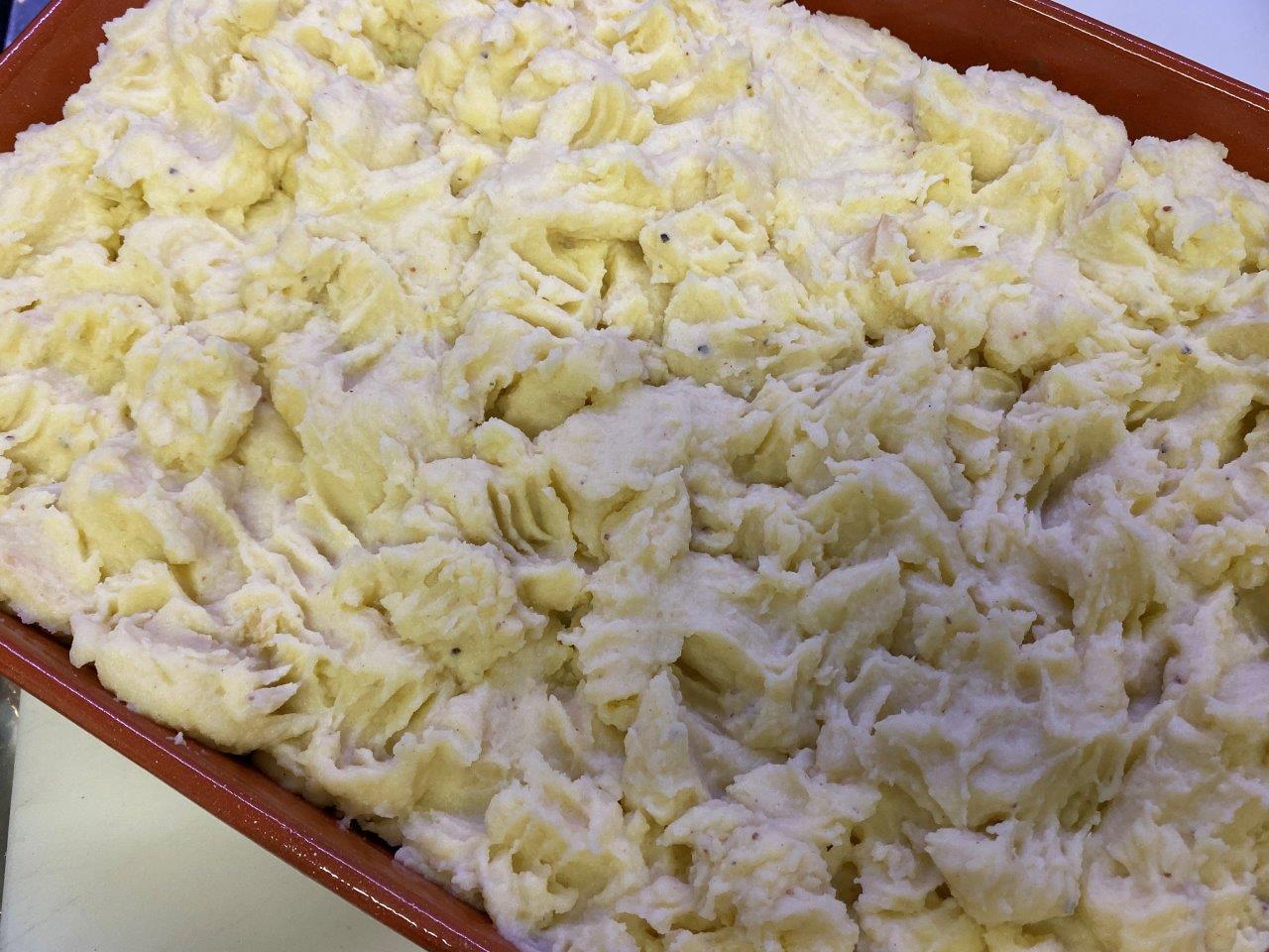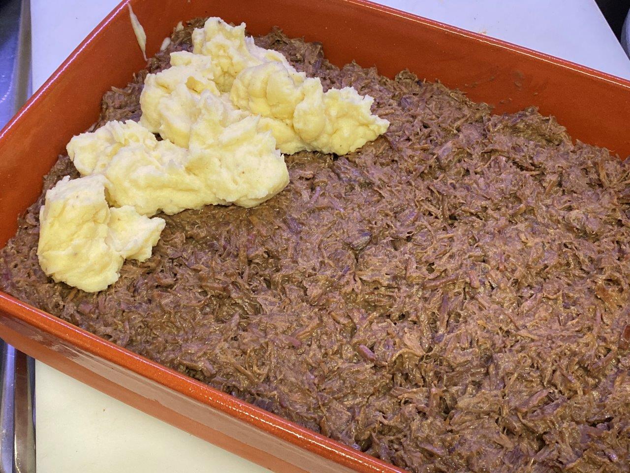 Numa travessa de barro, coloque uma primeira camada de puré de batata e a seguir ponha o recheio. Termine com outra camada de puré e use a colher para garantir que a última camada fica completamente irregular.