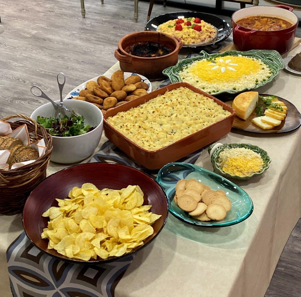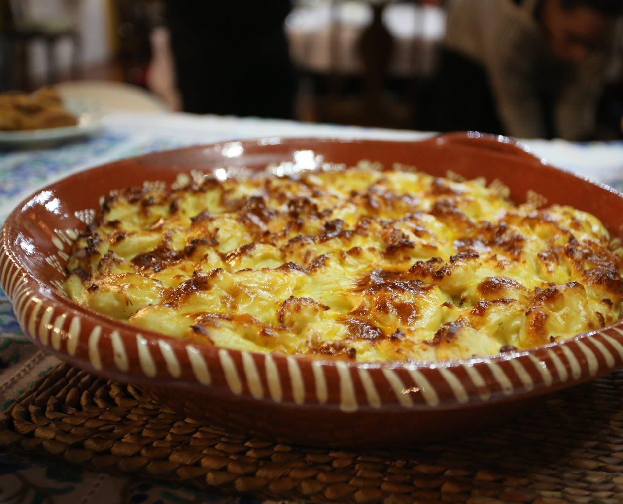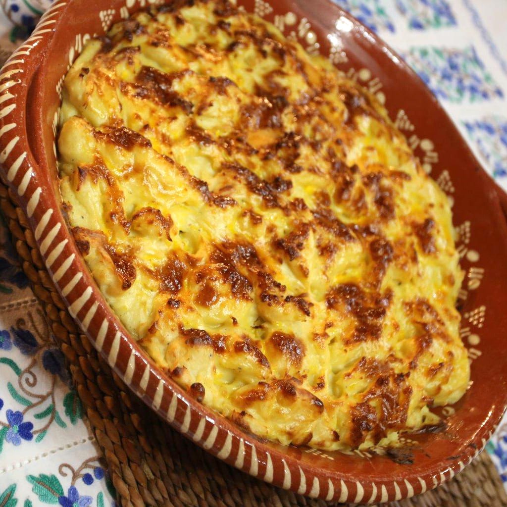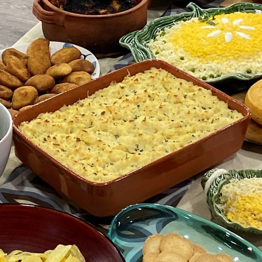 Numa travessa de barro, coloque uma primeira camada de puré de batata e a seguir ponha o recheio. Termine com outra camada de puré e use a colher para garantir que a última camada fica completamente irregular.