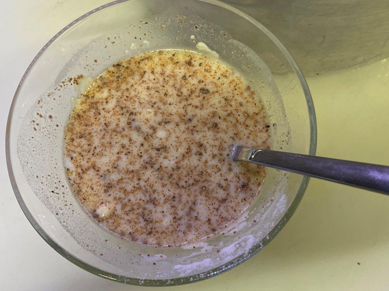 Num tacho com leite, junte os flocos de puré de batata e a noz-moscada. Se necessário vá acrescentando água até estar com uma textura cremosa, mas consistente.