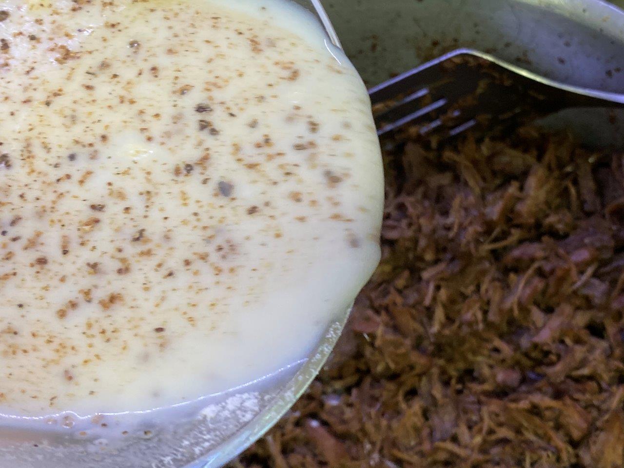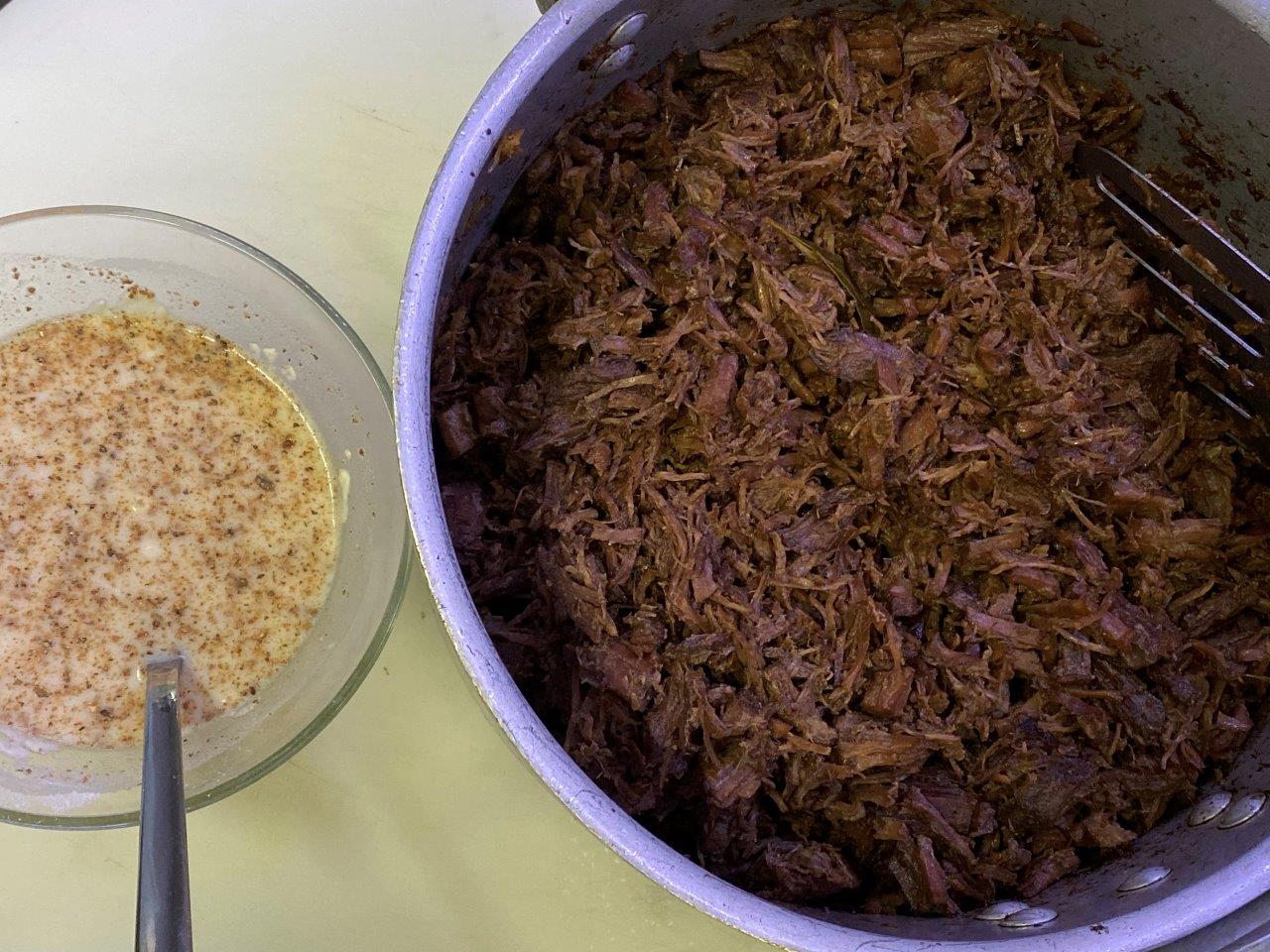 Dissolva a farinha no leite ainda frio, com cuidado para não formar grumos. Junte o molho da carne e deixe ferver até ficar como um creme (se necessário junte mais leite).
