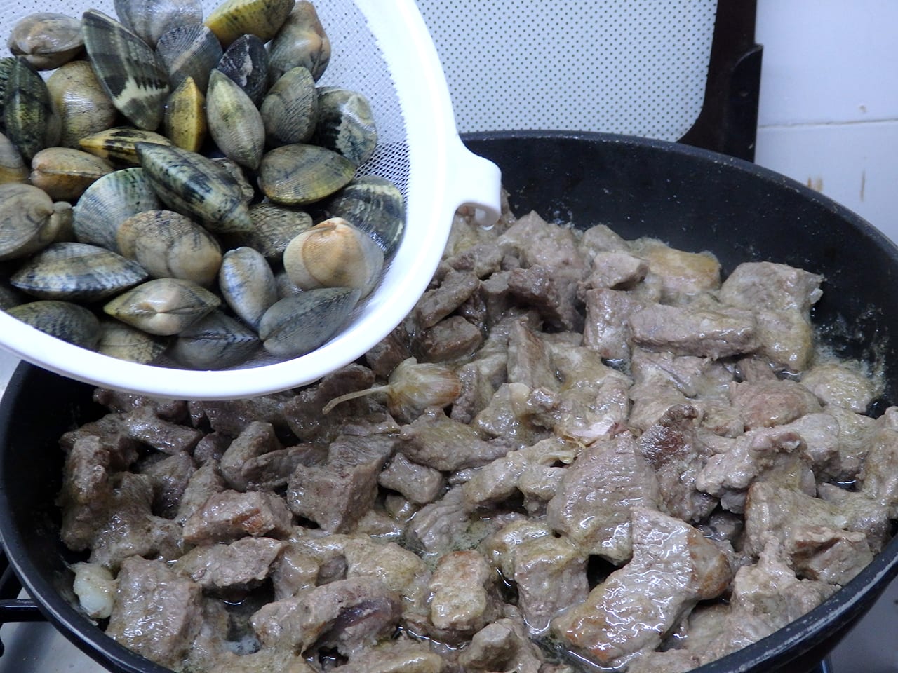 Numa frigideira com o Azeite e os Alhos, cozinhe a Carne. Quando estiver frita, junte as Ameijoas, o Sal e os Coentros.