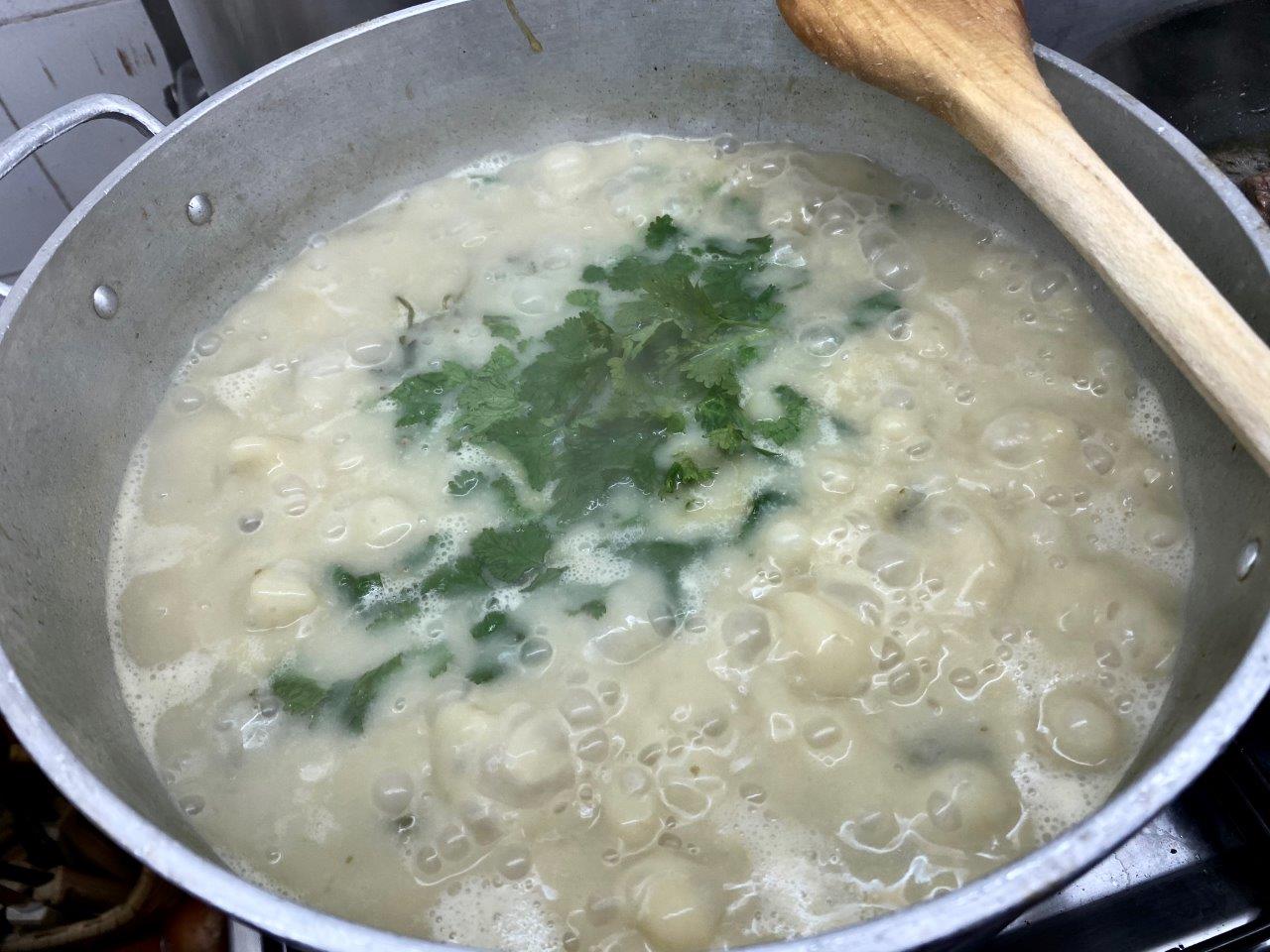Quando a massa estiver quase cozida, deite a água com a farinha e o resto dos coentros. Deixe engrossar ligeiramente o caldo, mas se ficar muito grosso acrescente mais água a ferver.