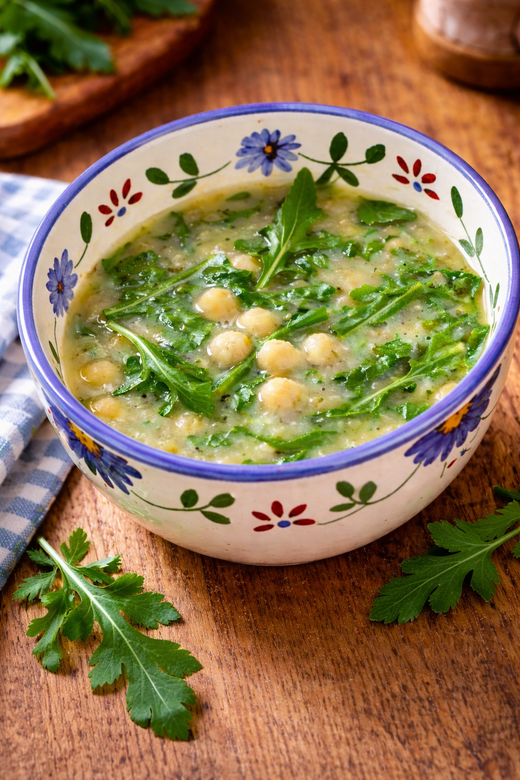 Sopa de grão e cebola com rúcula